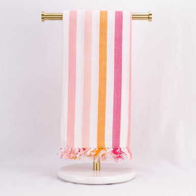 18x18 Perfect for a new homeonwer, this hand towel is pink and white stripes and has coordinating fringe at the bottom.